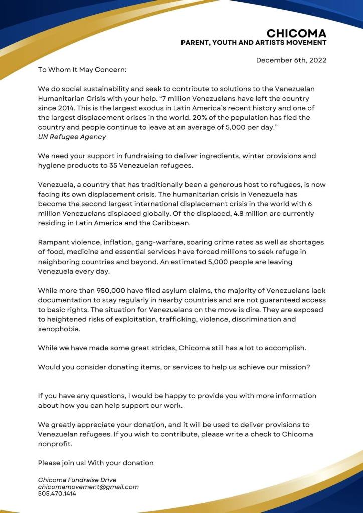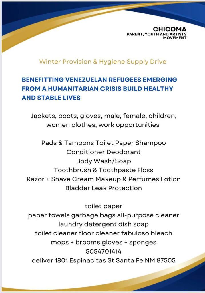 Chicoma was created by a Venezuelan Mother who immigrated to Santa Fe, NM. She realized that she has Venezuelan Refugee Relatives in desperate need in the City Differente, so she mobilized into action. Sage, the founder of Chicoma reached out to RILF in December 2022 for support in expanding mission-focused efforts and organizing to apply for a fiscal sponsor. If you would like to support Chicoma, you can reach them at (505)470-1414 or chicomamovement@gmail.com. Their immediate needs are listed below.